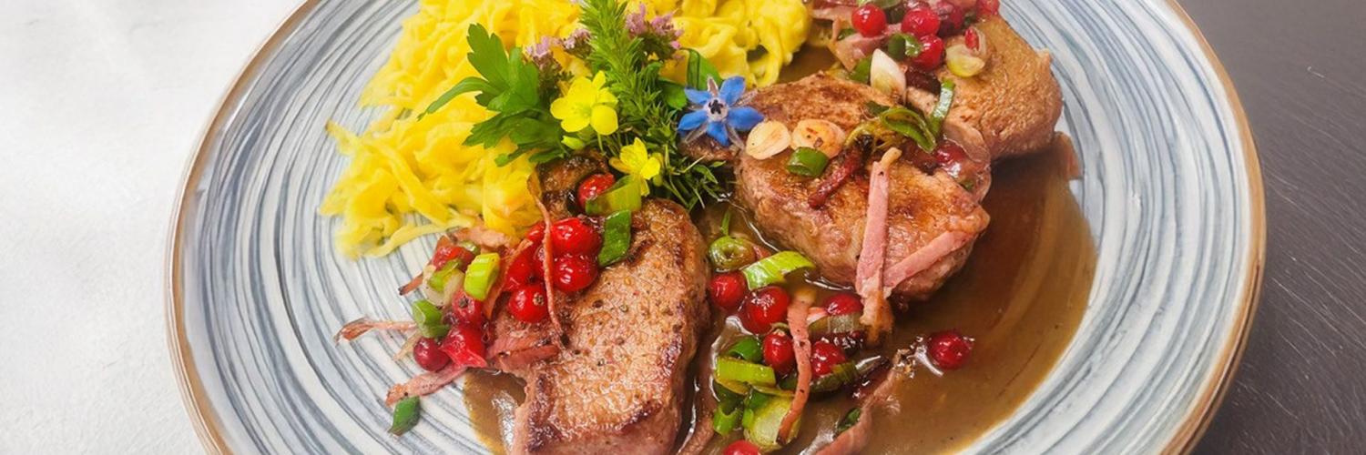 Unsere gepflegte Küche bietet den Genießern von nah und fern nicht nur regional schwäbische Spezialitäten und Gerichte der Saison, sondern auch Wildgerichte und Hausmacher Vesper, sowie Spezialitäten von Weidelämmern der Zollernalb, verfeinert mit Kräutern aus unserem eigenen Kräutergarten.